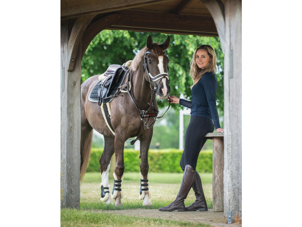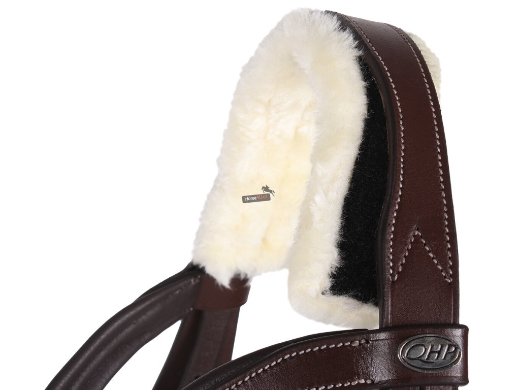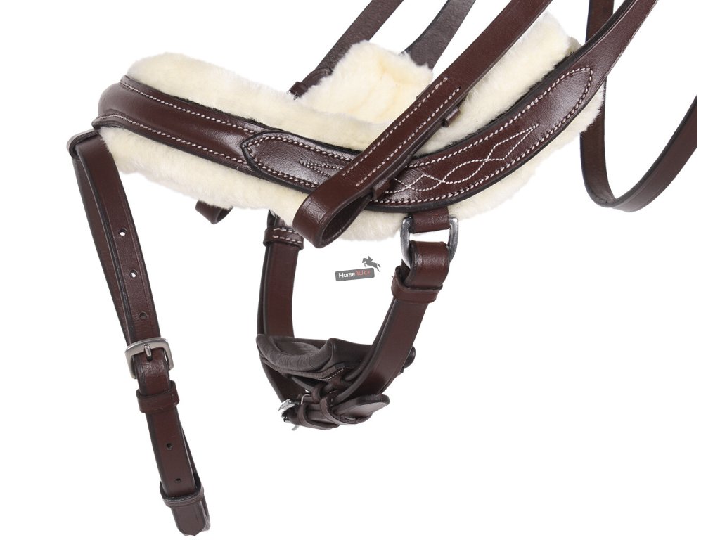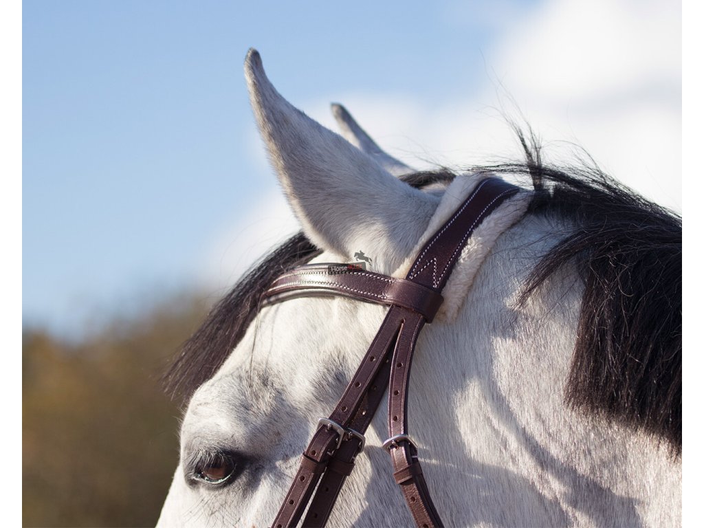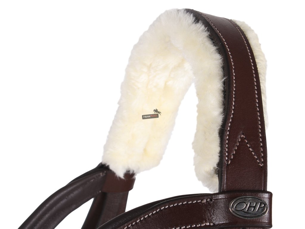 Anatomicky tvarovaná uzdečka podšitá umělým beránkem přírodního vzhledu. Podšívka je odnímatelná a lze ji vyprat. Podšívka zabraňuje podráždění a je proto ideální pro koně s citlivou pokožkou. Bílé dekorativní prošívání dávají uzdečce luxusní vzhled. Dodáváno včetně otěží.