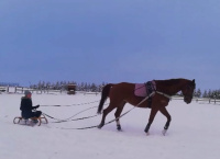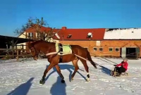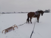Co ale dělat, když si chcete užít trochu legrace se svým koněm bez pomoci další osoby? Naučte si svého parťáka tahat sáňky a ovládejte si ho sami přímo z nich. Pokud koník zná a ovládá práci na dvou lonžích, máte z poloviny vyhráno. Dá se to naučit celkem dobře, můj teplokrevný valach s trochou anglické krve to zvládnul na jedničku. Bála jsem se úprků, ale spíše občas protestuje, pokud sáňky zapadnou do hlubšího sněhu. Přišel totiž na to, že když zastaví nebo dokonce zacouvá, nemusí táhnout. Když ho ale ukecám, je to paráda. Letos bych si moc přála, aby nám vyšlo počasí, a povozili jsme na sáňkách nebo bobech našeho nejmenšího člena týmu.
