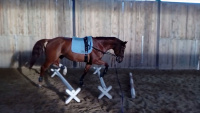 Každá práce s koněm by měla minimálně na začátku probíhat (i) ze země. I když je ale koník jezdecky znalý, občas není na škodu se na něj podívat i jinak, než jen ze sedla na jeho uši. Lonžování nemusí být jen nástrojem tupého vybití energie beze smyslu. Nikde není psáno, že koně musíte vyvazovat nebo že musí rotovat kolem vás hodinu. Můžete měnit tempo, rytmus, kmih, chody nebo velikost kruhu. Můžete se s koněm přesouvat a vysílat ho na cílená místa, například přes kavalety. Tady bych se chtěla zastavit. V zimním období se většinou nezačíná rovnou skákat, ale postupně se k parkuru dostáváme přes kavaletová cvičení. Může jít o kavalety jednotlivé i celá cvičení. Mohou být překonávány ve všech chodech podle toho, jak jsou postavené, a mohou ležet jak na zemi, tak mohou být vyvýšené. A právě kavalety můžete s přehledem využít i ze země, kdy krásně vidíte, jak kůň pracuje s končetinami i se hřbetem. Kavalety na kruhu jsou účinným cvičením pro všechny kategorie koní. Podle vzdálenosti mezi bidly můžete efektivně uplatnit pomalý shromážděný klus, prodloužený klus i cval. Zvýšením kavalet docílíte soustředěné práce s nohama a krásně zaměstnáte hlavu koně. Není potřeba pokaždé jezdit, efektivní práce lze docílit i ze země. A máte na lonžování veškeré potřebné vybavení? Nepřehlédněte například skládací lonžovací bič!😁