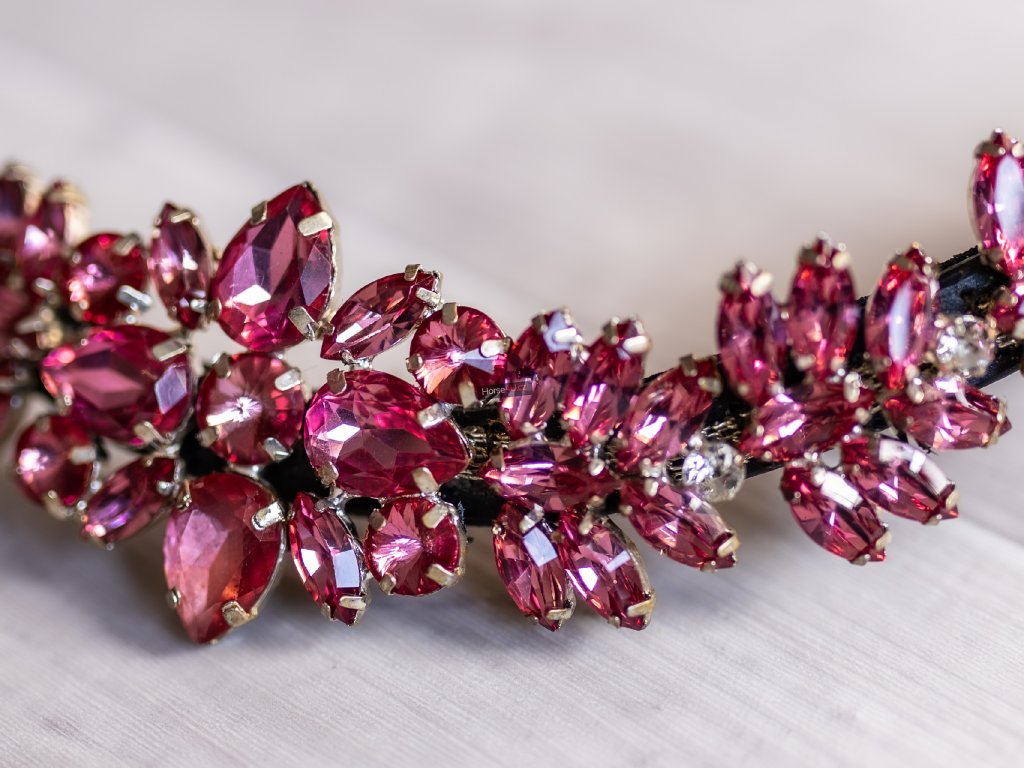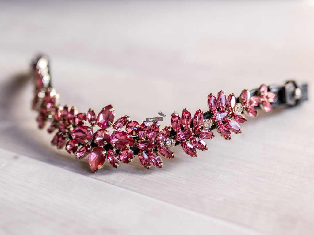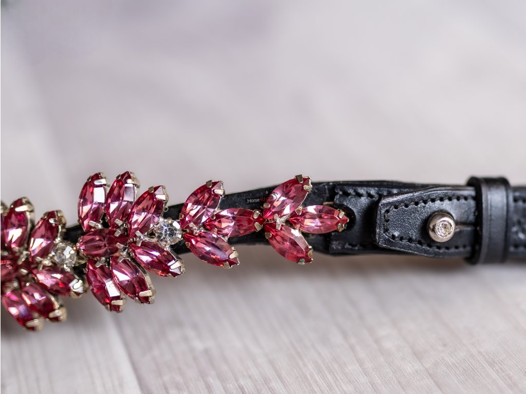 Originální čelenka, která má kamínky vsazeny do zpevněného kovového pásku, který je veden v jednom kuse a je obšitý dovnitř kůže. Čelenka je pevná, ale zároveň ohebná a přizpůsobivá. Každý kus je originál, poctivá ruční práce. Volná linie, která lemuje hlavu koně. Perfektní na focení, akce, závody nebo jen tak, když chcete být vidět. Zapínání na cvoček. Černá kůže.