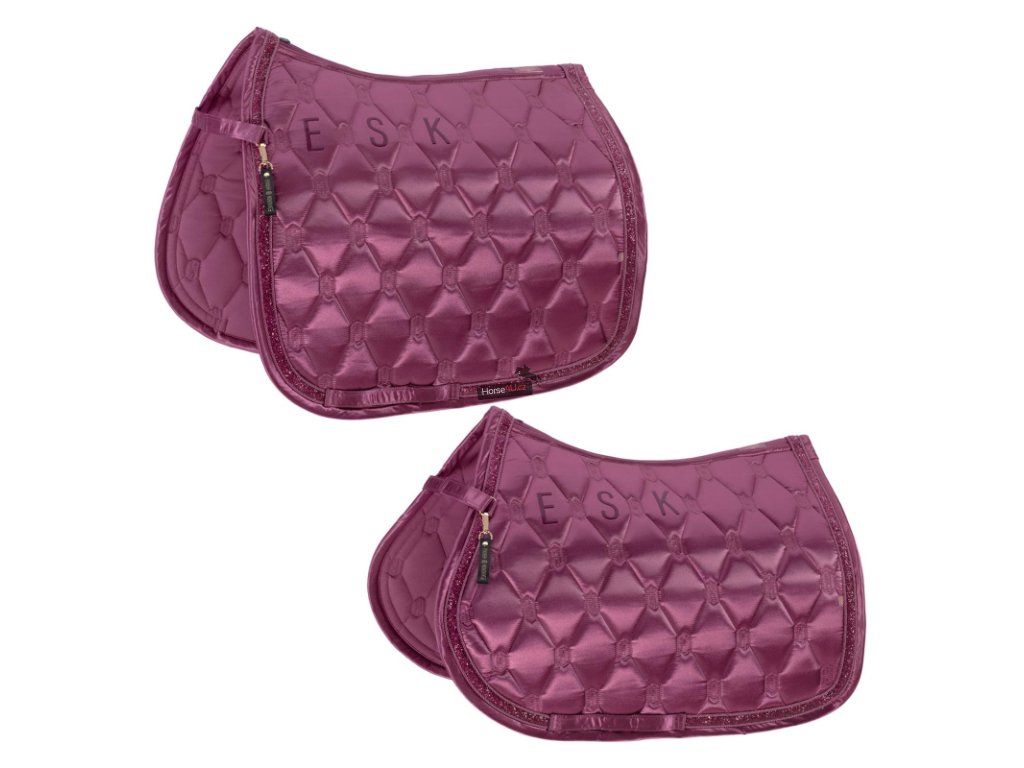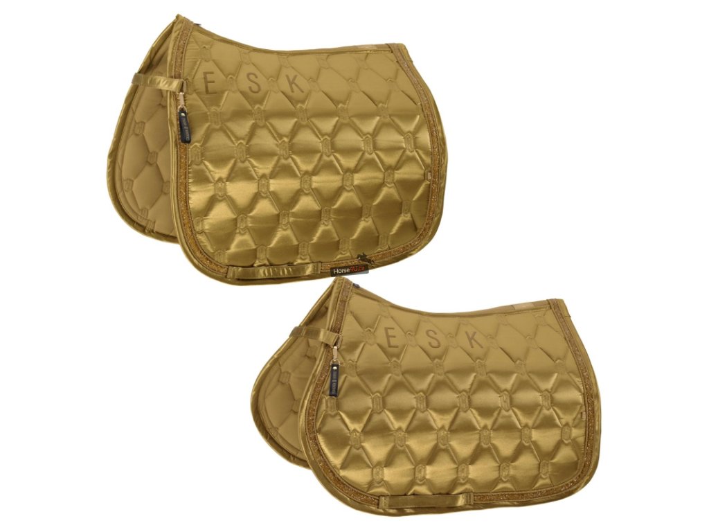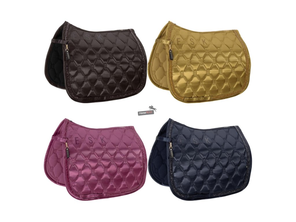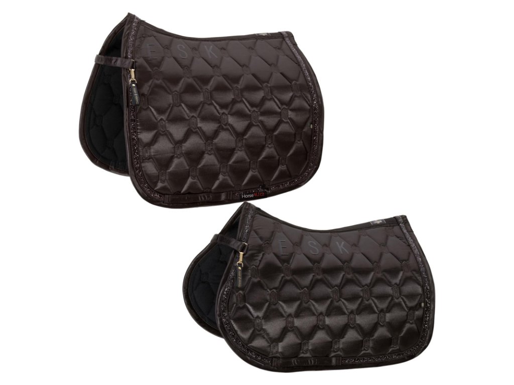 Elegantní dečka prošívaná dvojitým elegantním vzorem ze speciální lesklé látky lemovaná krystalky. Lem ve stejné barvě. S protiskluzovým nápisem ESK. Síťovaný páteřní kanál pro ventilaci. Systém Innostrap. Poutko na podbřišník s trojitou možností uchycení. Štítek s vlajkou Heritage na obou stranách. Včetně kroužku na klíče Eskadron.