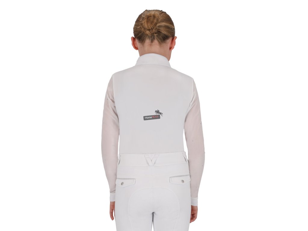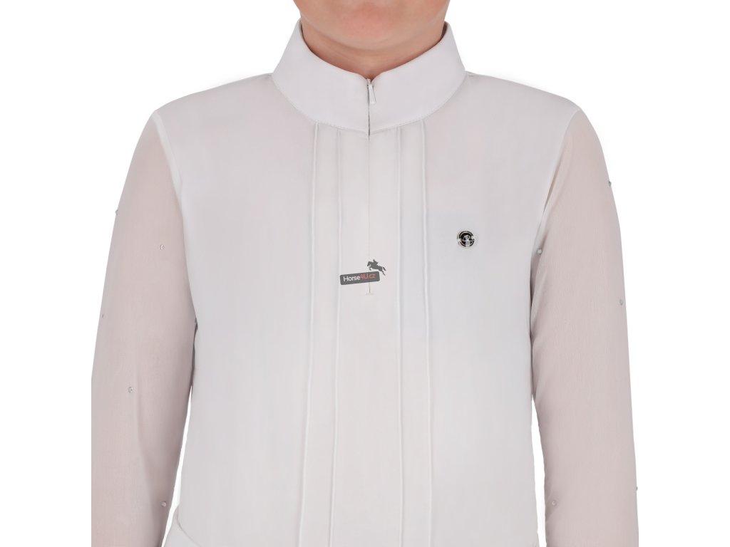 Závodní jezdecké triko Sennah s dlouhým rukávem ze zimní kolekce se vyznačuje pružnými síťovanými rukávy zdobenými kamínky. Díky pružné látce nabízí skvělé pohodlí při nošení a má skrytý zip a zapínání na patentku na levé straně hrudi.