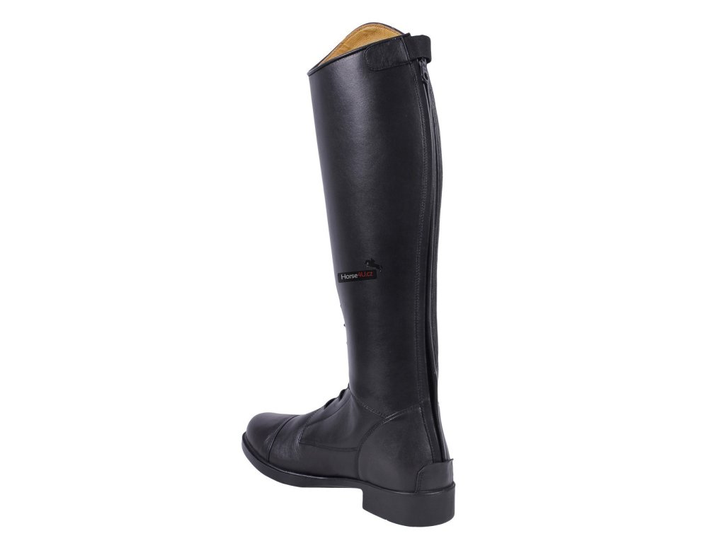 Stylové jezdecké boty z kravské kůže na šněrování s pružným elastickým páskem u zipu na zadní straně. Nahoře zdobené pruhem a knoflíčkem QHP. Podšívka je opatřena prodyšnou látkou, vnitřní podešev je z umělé kůže. Širší obvod holeně i pro pořádný ženský :)