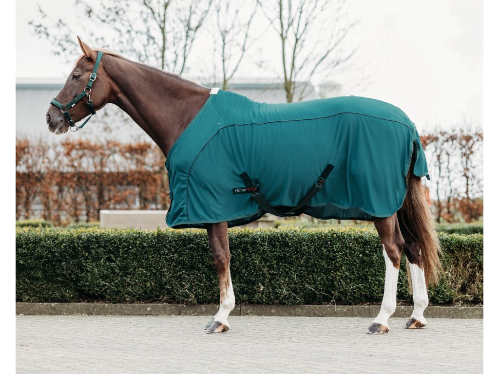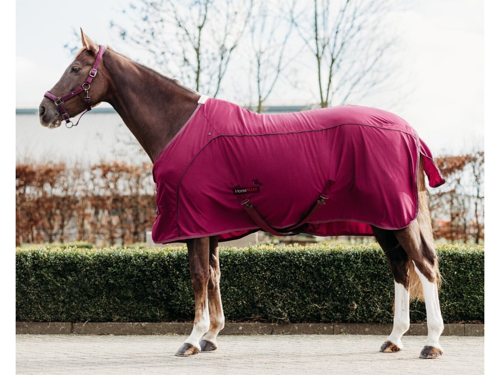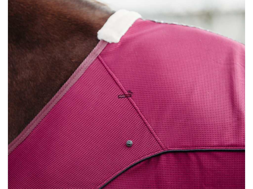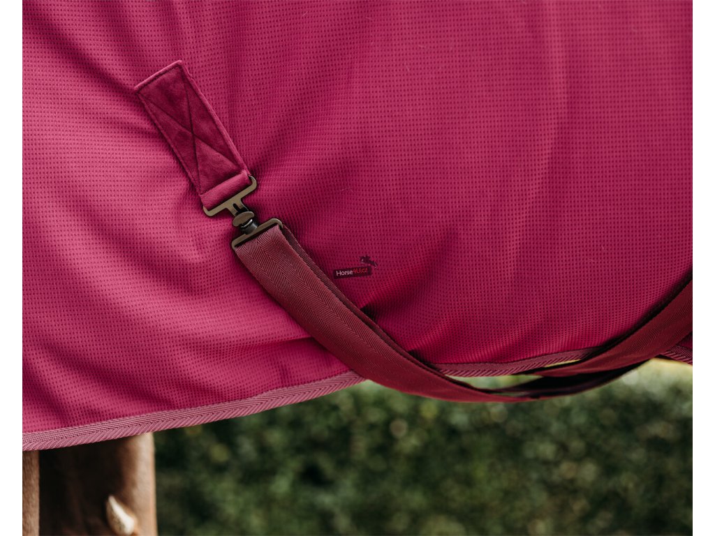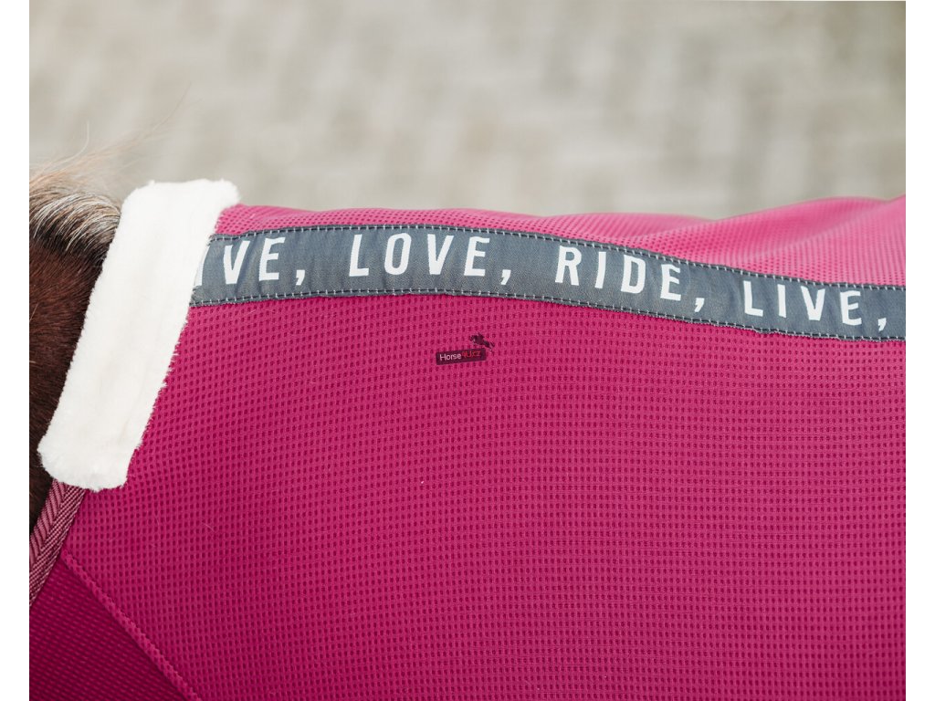 Deka Astana je vyrobena z materiálu coolmesh. Ideální pro použití během přepravy nebo po jízdě. Deka je svrchu ozdobena páskou s textem „Live, love, ride“. Křížové zapínání pod břichem. Kryt na ocas.