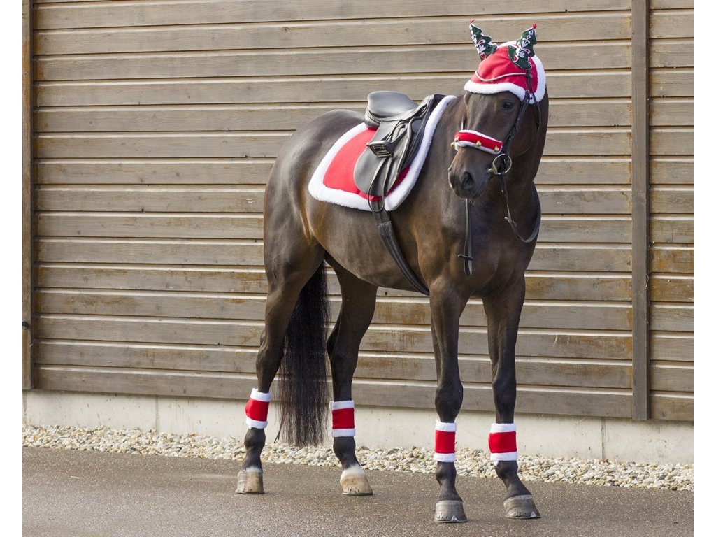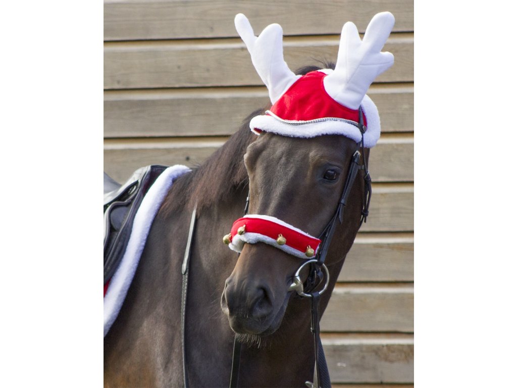 Legrační čabraka pro koně s bílými sobími parohy a podšívkou. Tradiční ostře červená barva dozdobena bílými prvky.