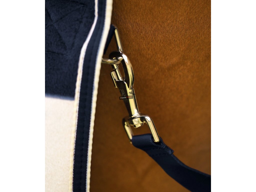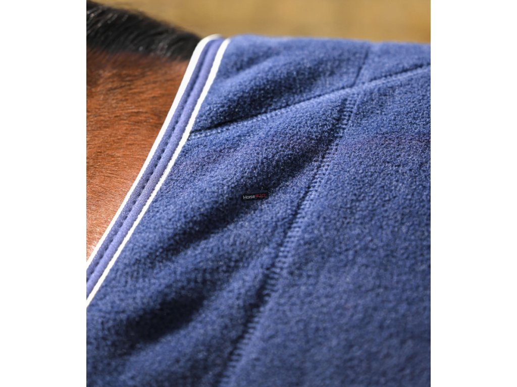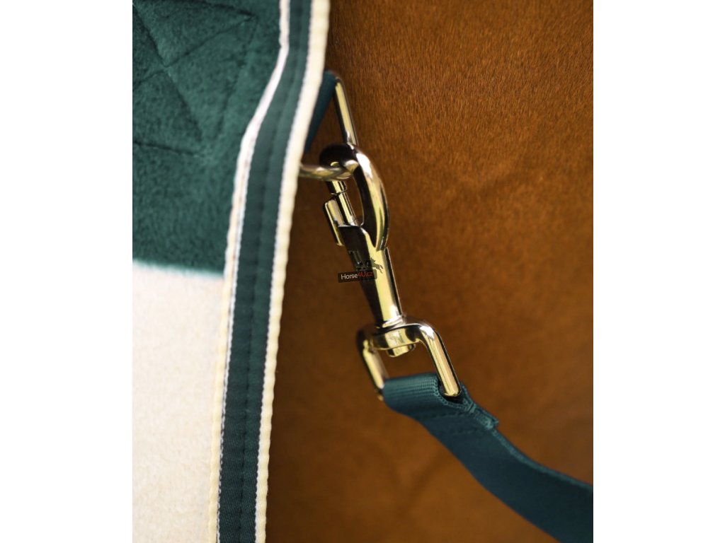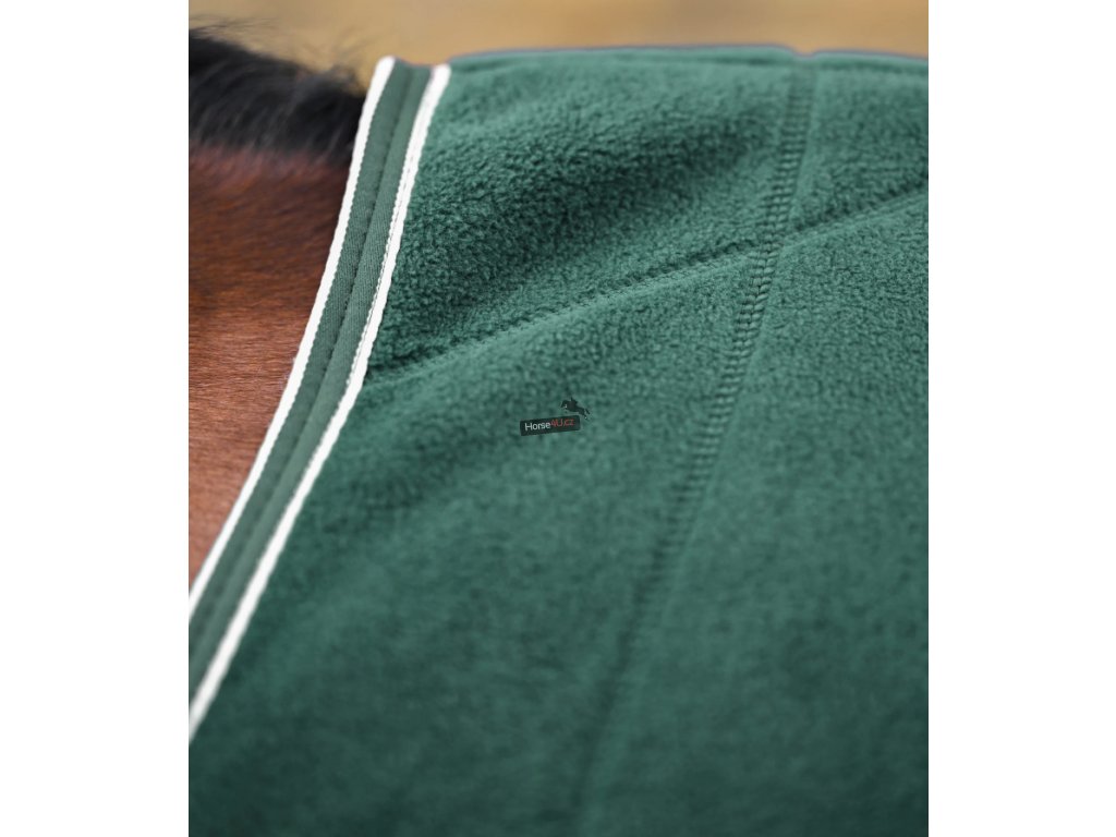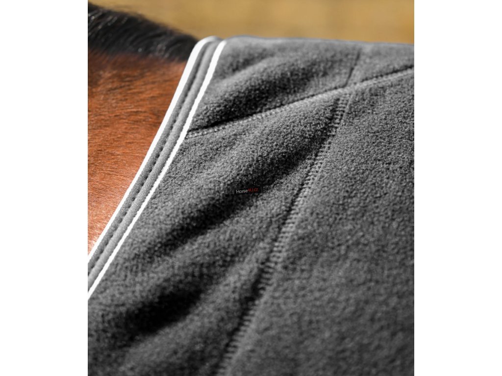 Odpocovací fleecová deka Vellus je vyrobena z prémiového 520g polar fleece s úpravou proti žmolkování a nabízí měkkou izolační vrstvu, která udrží vašeho koně v teple a pohodlí. Dvojité zapínání ve tvaru T na přední straně s bezpečným dvojitým uzamykáním zajišťuje pohodlné nošení, zatímco zesílené prošívání u výstřihu a v pase pomáhá udržovat tvar deky a zabraňuje nežádoucímu natahování. Měkké pohodlné lemování umocňuje celkový dojem a nastavitelný zadní popruh zajišťuje větší stabilitu. Tato deka, zakončená vytříbeným vyšívaným logem a prostorem pro personalizaci, v sobě spojuje praktickou funkčnost s elegantním a profesionálním vzhledem – což z ní činí nezbytný doplněk šatníku každého koně.