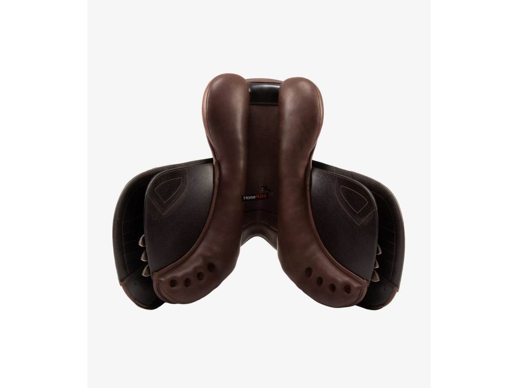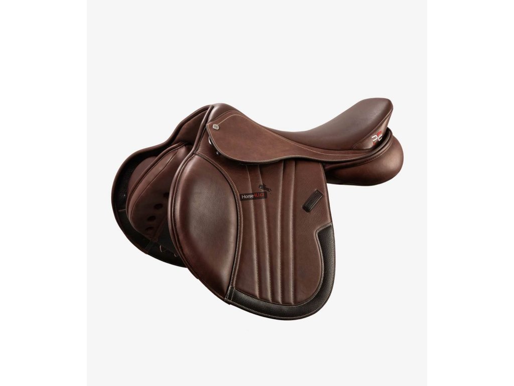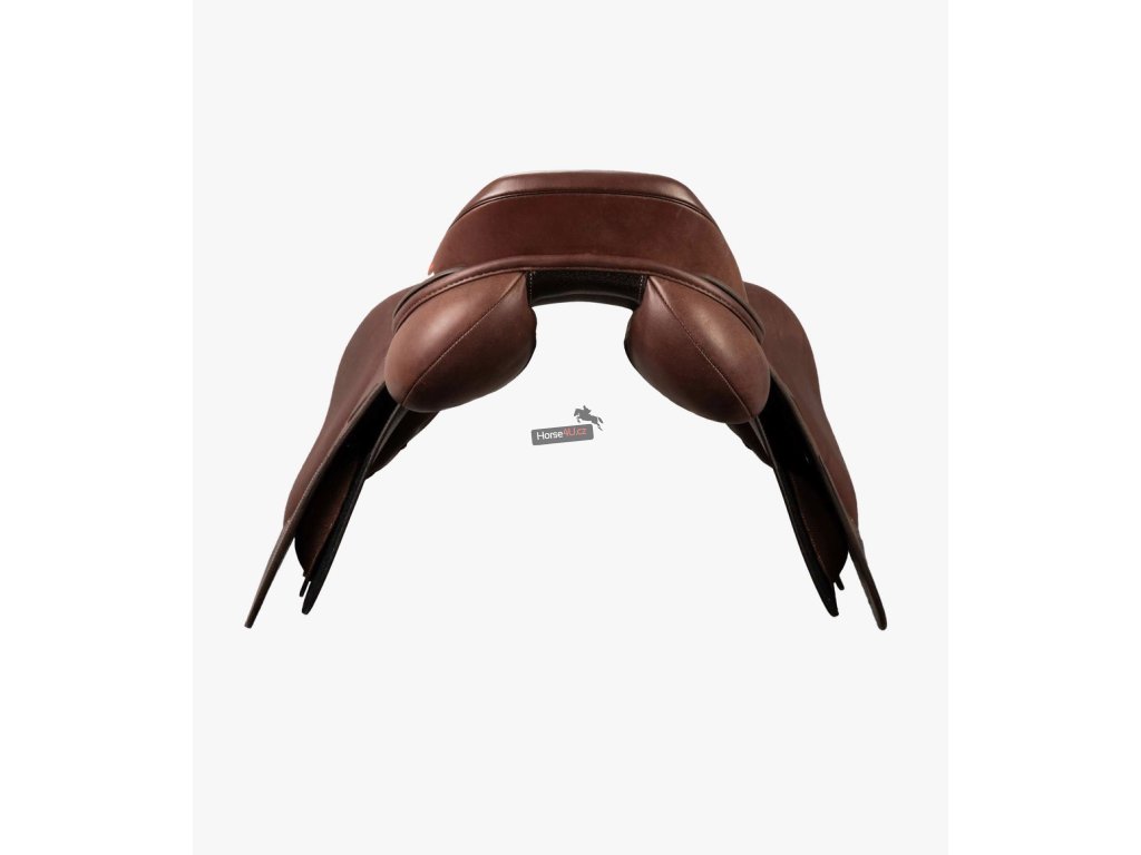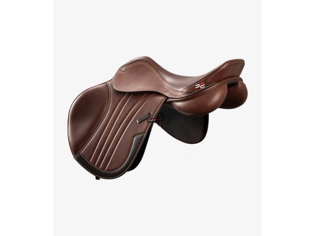 Skokové sedlo vyrobeno z německé anilinové kůže s těsným kontaktem. Konstrukce těsného kontaktu má dopředu vykrojené kolenní opěrky, které napomáhají správnému umístění nohy. Polypropylenová kostra je extrémně lehká a má neuvěřitelné vlastnosti, které umožňují ohýbat se tak nepatrně, že zabrání prasknutí pod napětím, ale poskytnou brilantní oporu sedlu. Má vyměnitelné komory. Polštáře polstrované syntetickou vlnou, přední kroužky na sedle. Vyvážené, rovnoměrné rozdělení tlaku, které neomezuje v pohybu. Dodává se standardně se střední komorou. Vyšívané logo PE a celkové ozdobné prošití. Včetně ochranného obalu.