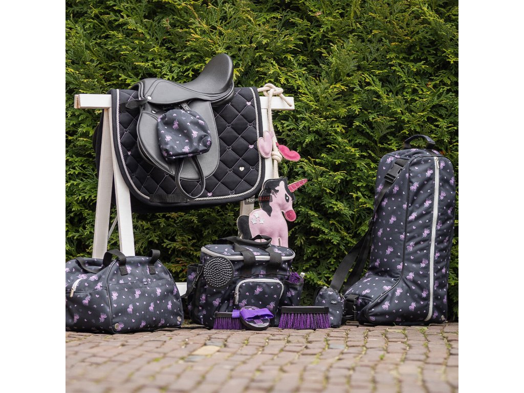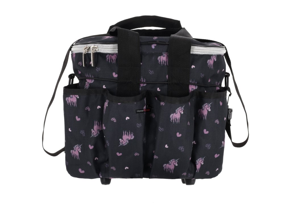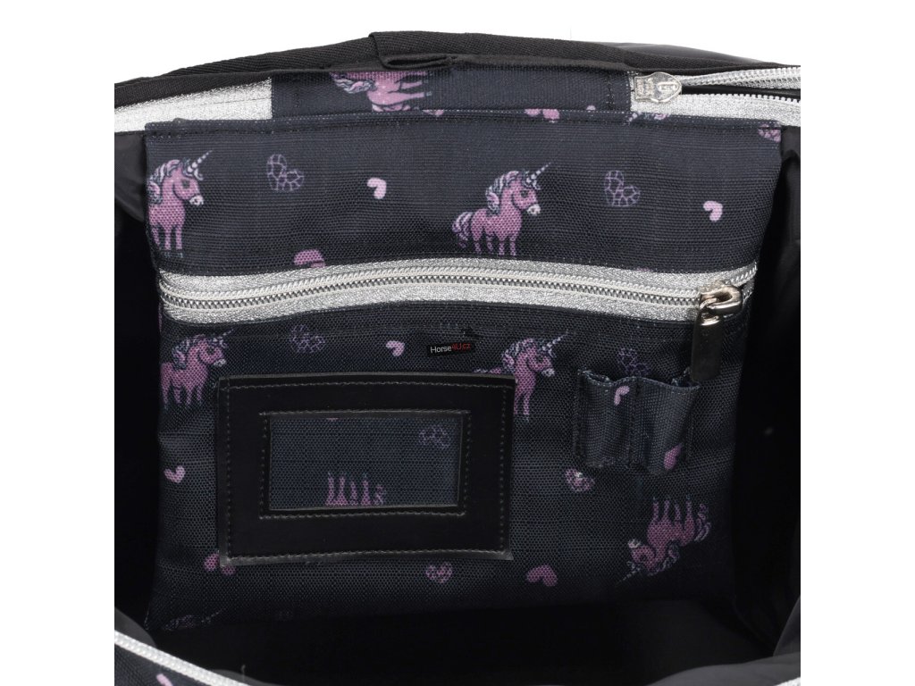 Velkokapacitní taška vyrobená z voděodolného materiálu. S velkým množstvím kapes, včetně kapsy na zip na vnější straně. Z vnitřní strany je další kapsa na zip. S madly a odnímatelným ramenním popruhem. Se vzorem roztomilých jednorožců a srdíček.
