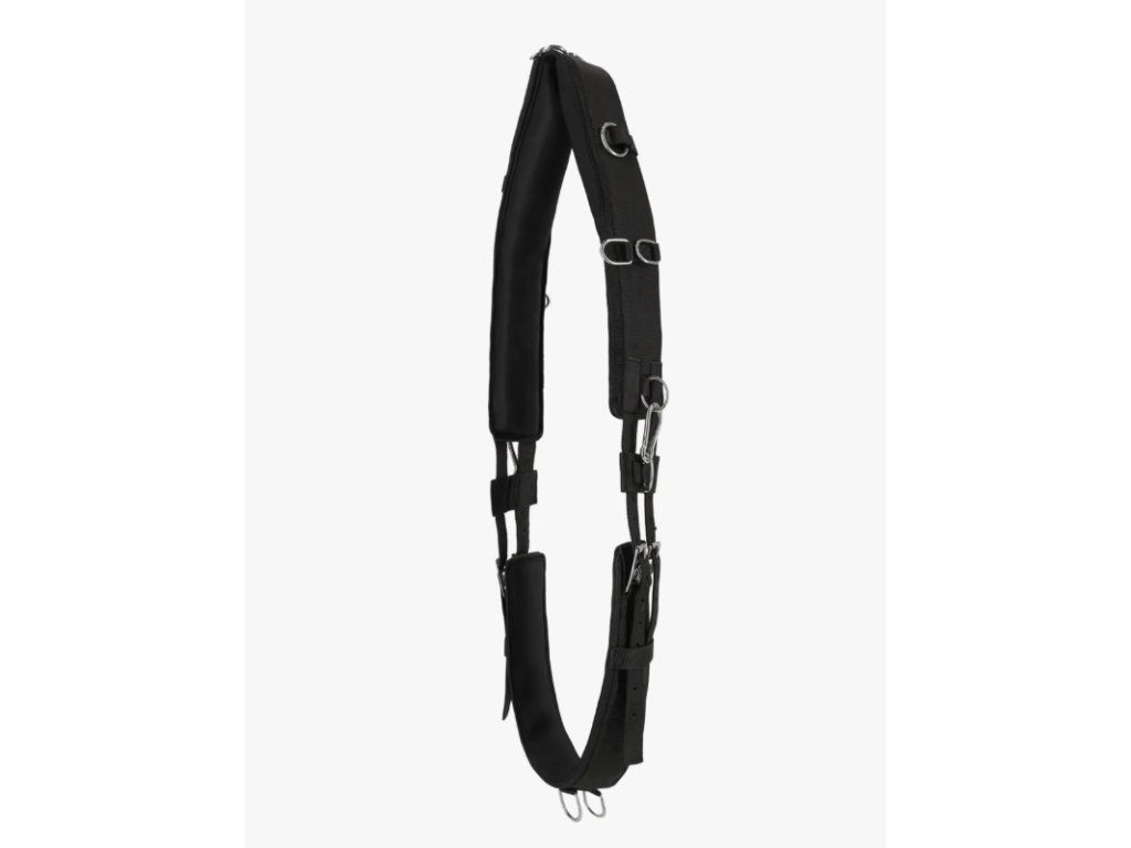 Lonžovací podbřišník s měkkým polstrováním, vybavený 11 kroužky pro připnutí lonžovacích pomůcek.