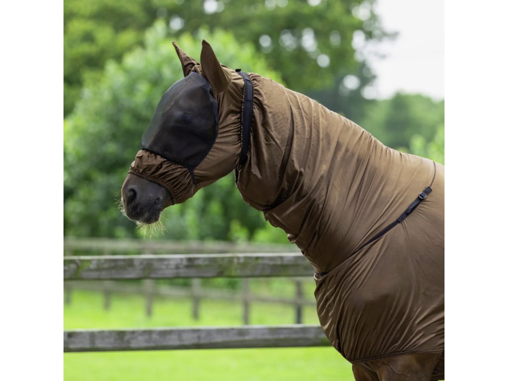 Kvalitní maska proti hmyzu s ušima z pevného materiálu s jemnou síťovinou. Tím je zajištěno, že koně neobtěžuje otravný hmyz. Maska je vybavena měkkým beránkem podél celého okraje. Snadno se nasazuje, zapínání pomocí suchého zipu.