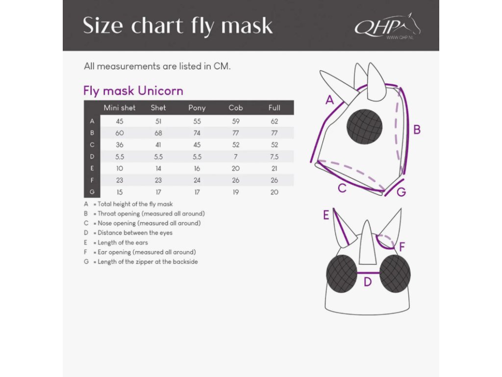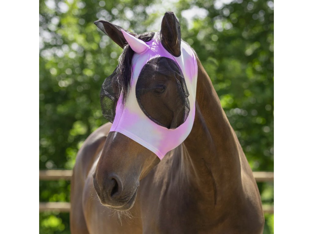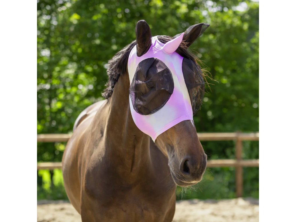 Duhová maska s rohem je navržena tak, aby nošení masky proti muchám bylo pro koně co nejpohodlnější. Hladká a elastická látka působí jako druhá kůže. Síťka u uší a očí poskytuje jasný výhled a udržuje mouchy a hmyz v dostatečné vzdálenosti. Otvor na čupřinu. Maska se snadno zapíná pomocí zipu ve spodní části.