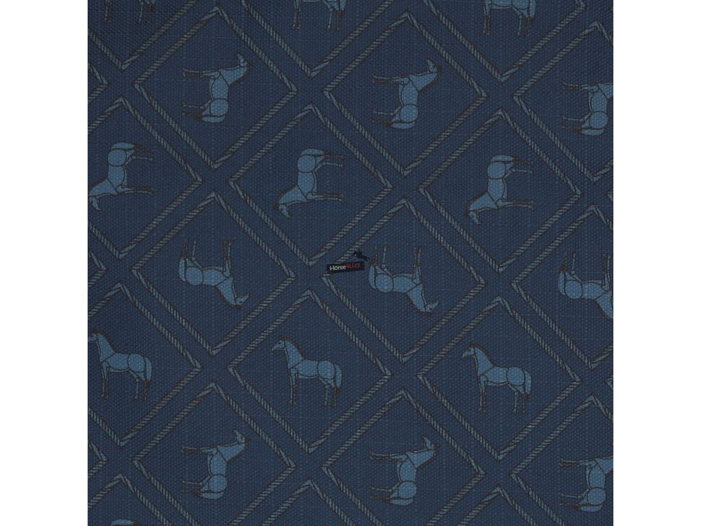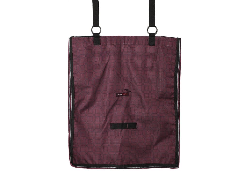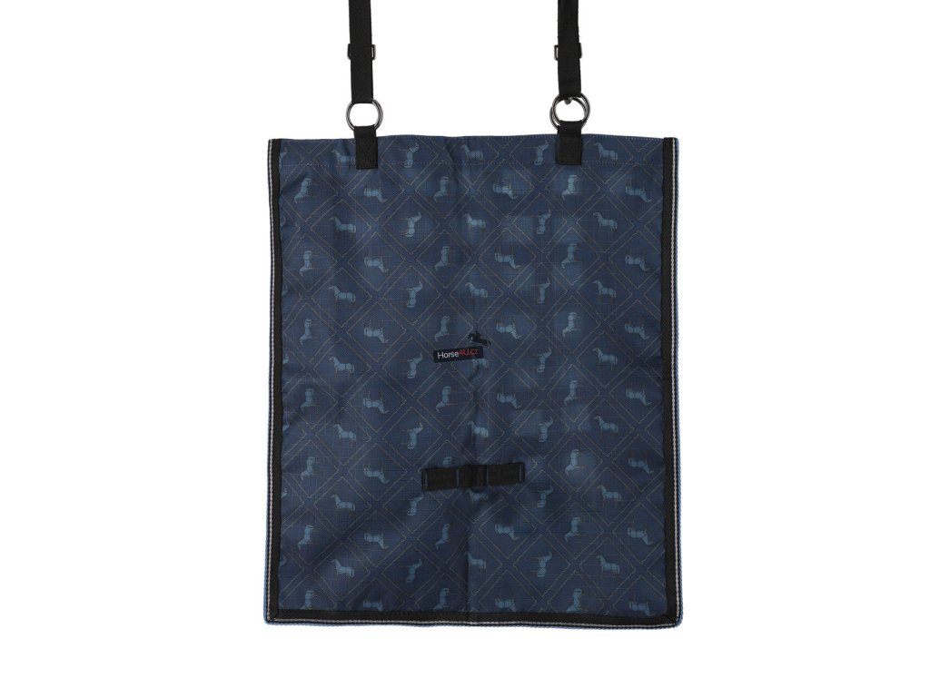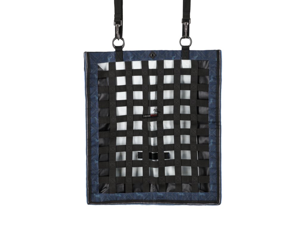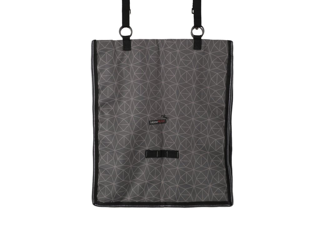 Taška na seno se síťovou přední stranou ze širokých pruhů látky. Má čtyři kroužky na horní straně s nastavitelnými poutky pro připevnění tašky. Vyrobeno ze silné tkaniny 600D, tedy ji kůň jen tak nepoškodí. Rozměr 63,5 x 53 x 18 cm.