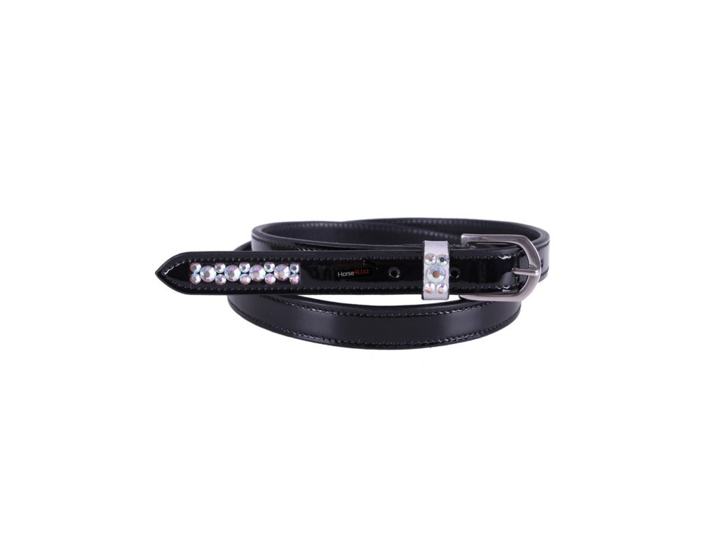Jezdecký opasek s různými velikostmi stříbrných kamínků na konci. Lakovaný, lesklý, kožený.