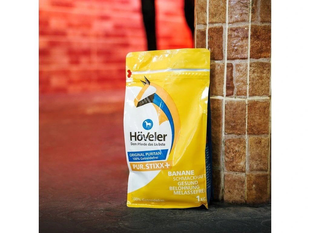 Höveler Pur.StiXX s banánem jsou chutnou odměnou bez obilí, melasy a umělých přísad. Šetrně sušené trávy a byliny obsahují řadu přírodních životně důležitých látek a umožňují tak přirozené krmení. Recepturu doplňují vysoce kvalitní suroviny jako lněné semínko, jablečné výlisky, čekanka, ostropestřec a samozřejmě banán.