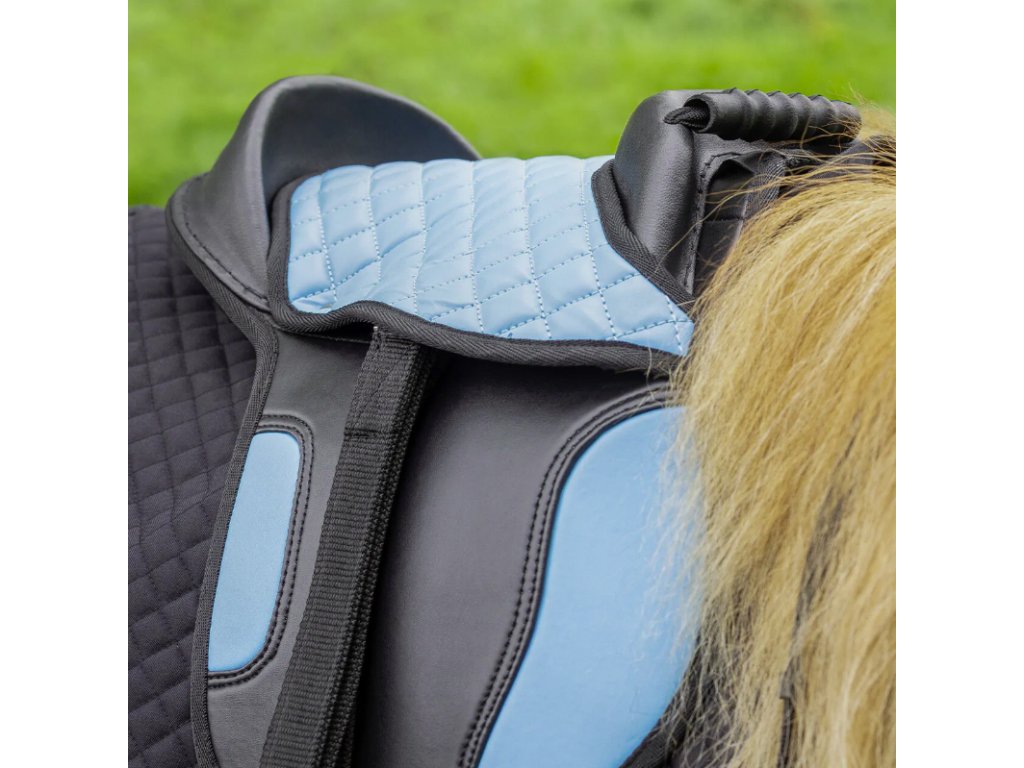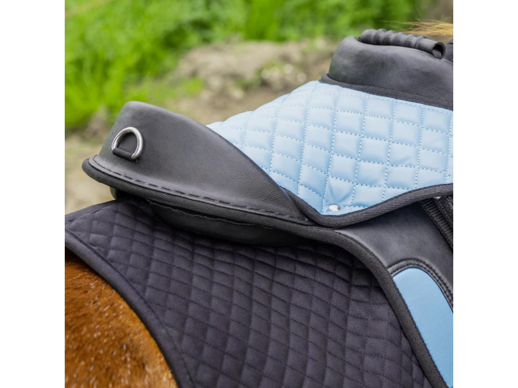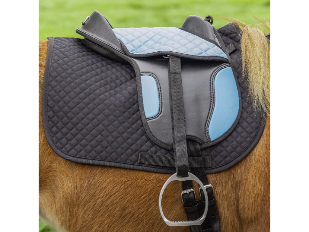 Syntetické dětské sedlo se dodává včetně podbřišníku, třmenů i třmenových řemenů. Délka sedla je 29 cm, délka posedlí 21 cm (sedlo nemá kostru, proto se rozměry neuvádí tradičně v palcích). Ideální pro malé jezdce, kteří jsou schopni sednout na svého poníka a sami jezdit. Madlo na přední straně pro uchopení. Kroužek na zadní straně pro případné upevnění podocasníku.