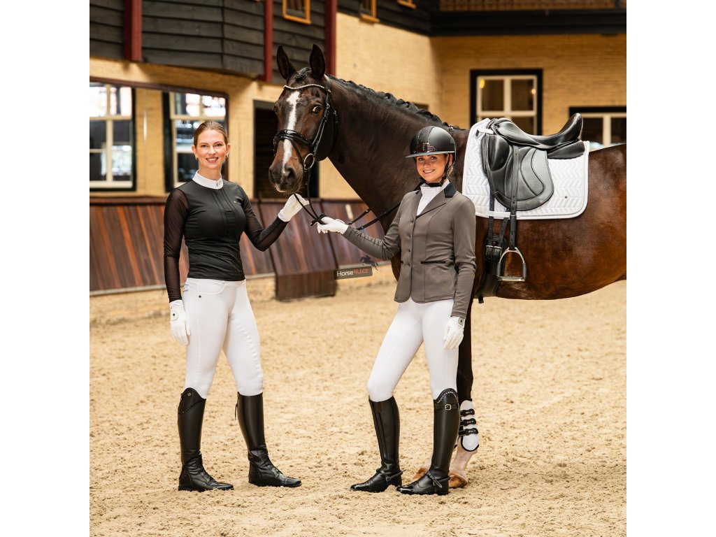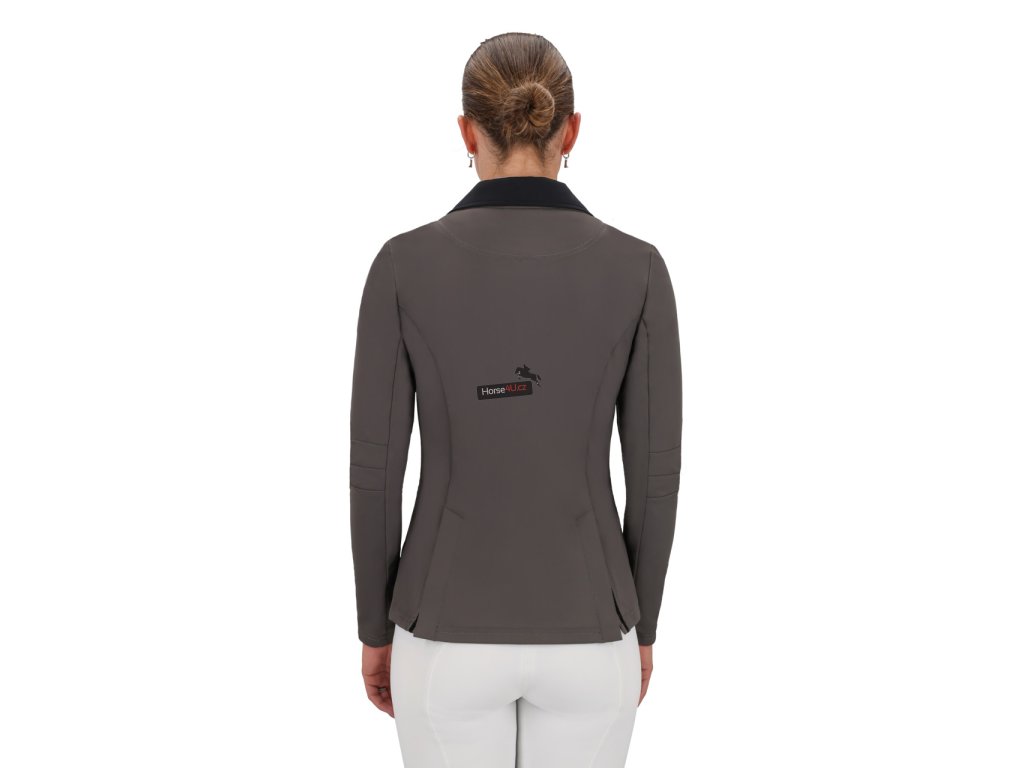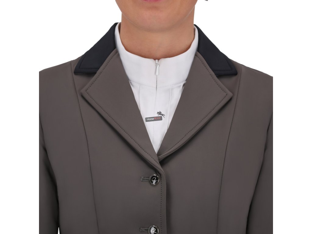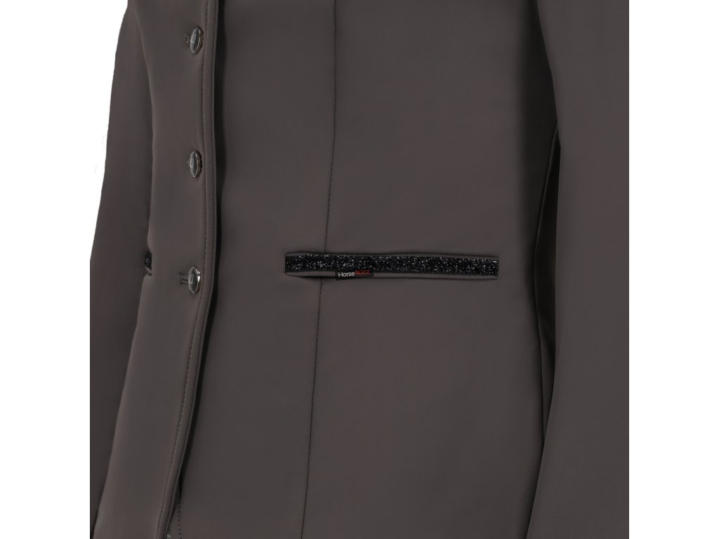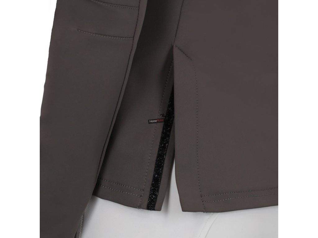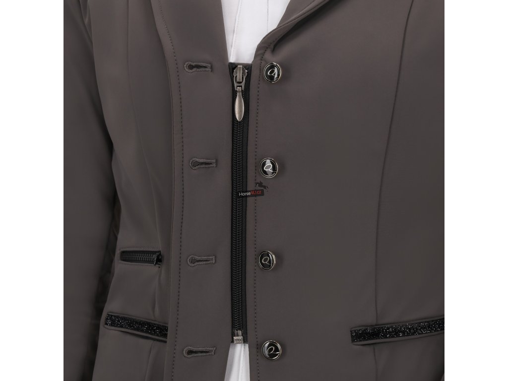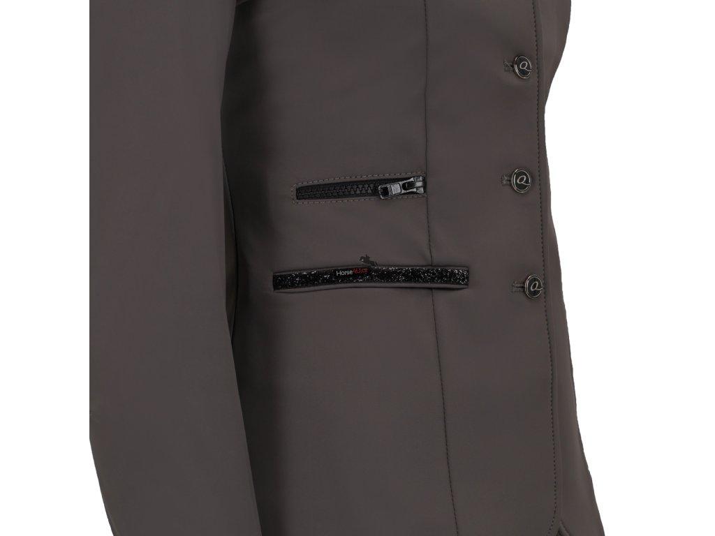 Elegantní sako má skrytý zip za zapínáním na knoflíky. Pružná, prodyšná tkanina zajišťuje pohodlnou jízdu a je také voděodolná. Sako ozdobeno třpytivou páskou na kapsách na zip a černou kapsou na umělý zip.