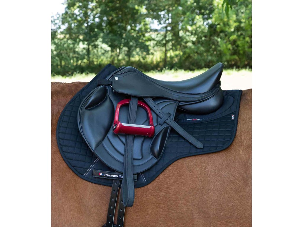 Horní vrstva Tech Grip gel je tvarovaná tak, aby přesně seděla pod sedlem a pomáhala omezit nežádoucí pohyb a sklouzávání. Horní část je navíc jemně polstrovaná pěnou a podšitá měkkou protiskluzovou tkaninou, která je příjemná na kůži vašeho koně a dále zabraňuje posouvání.