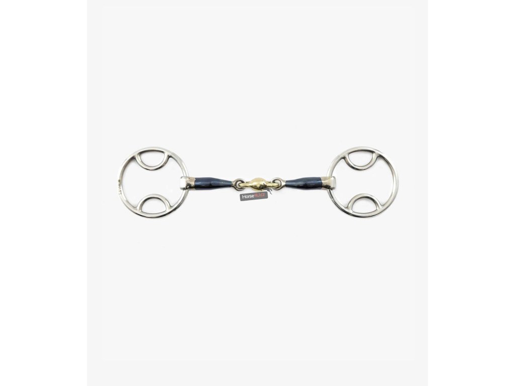 2x lomené vícetypové udidlo s modrým udítkem a mosazným středem. Udidlo podporuje slinění a napomáhá uklidnění a soustředění koně. Velikost udítka - 15mm. Modré sladké železo snadno oxiduje, což vytváří hřejivý pocit a sladkou chuť v hubě vašeho koně, čímž napomáhá přijímat dobře udidlo. Modrá barva používáním vybledne, což je normální.