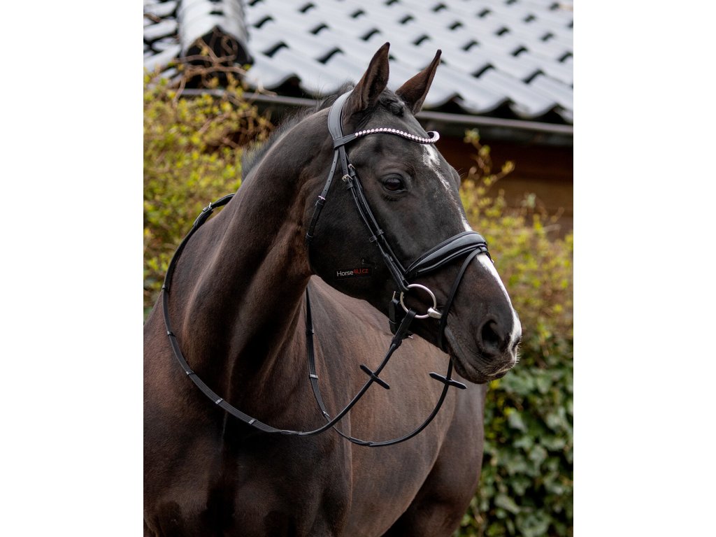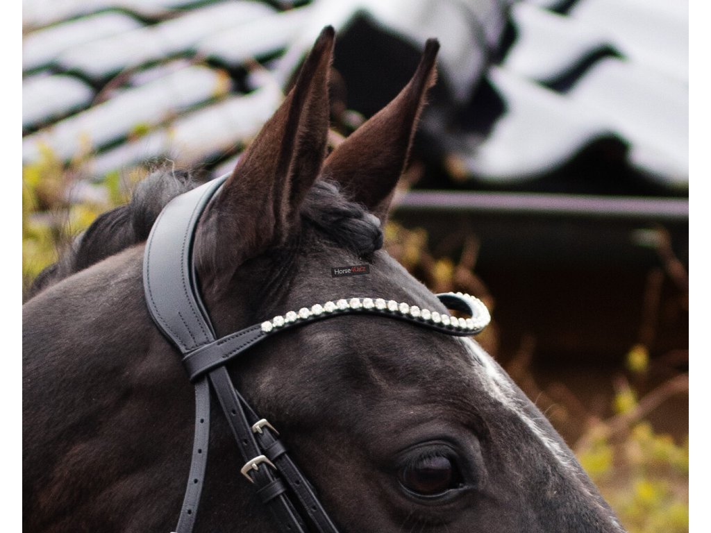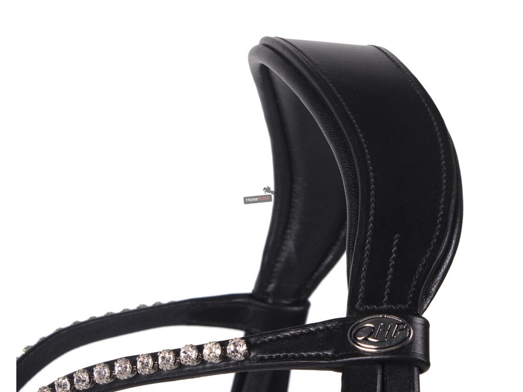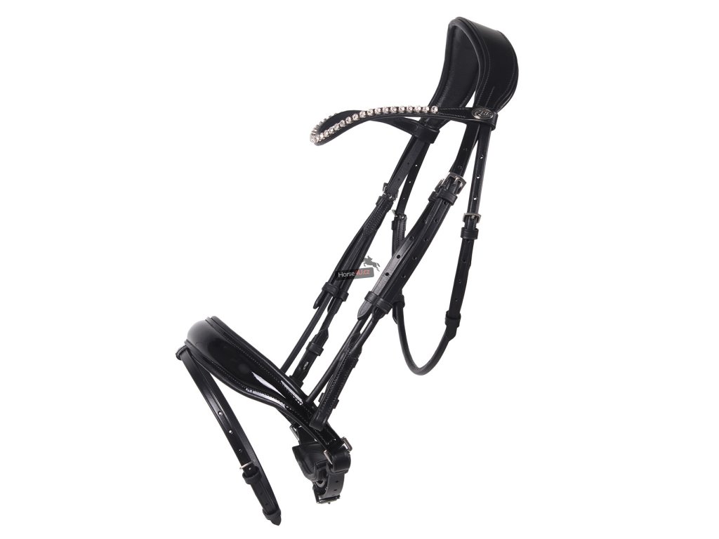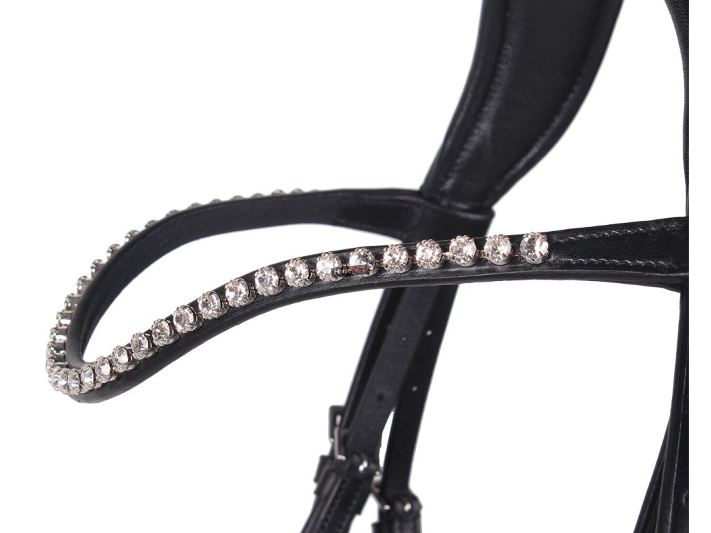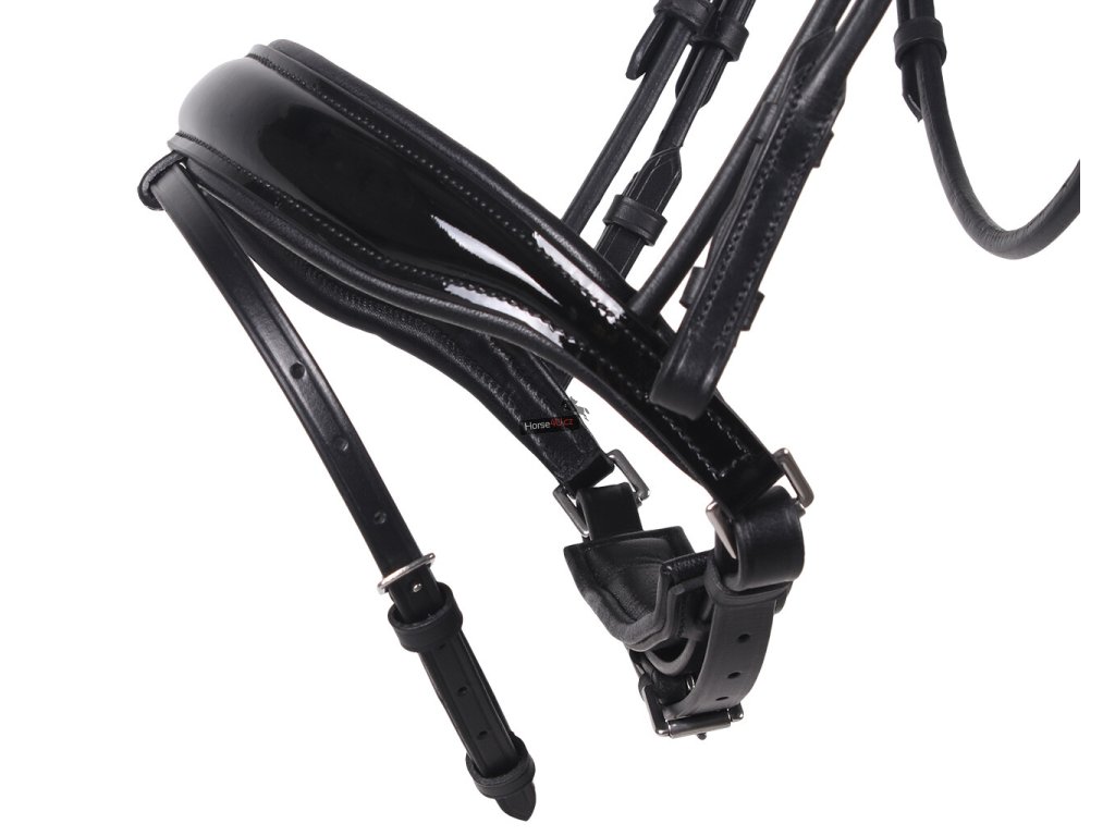Uzdečka Nehza získává svůj elegantní vzhled díky kulatým prošívaným lícnicím a čelence z lakované kůže s kamínky. Pohodlná díky měkkému polstrování, širokému anatomicky tvarovanému nátylníku a anatomicky tvarovanému nánosníku. Dodáváno včetně otěží.