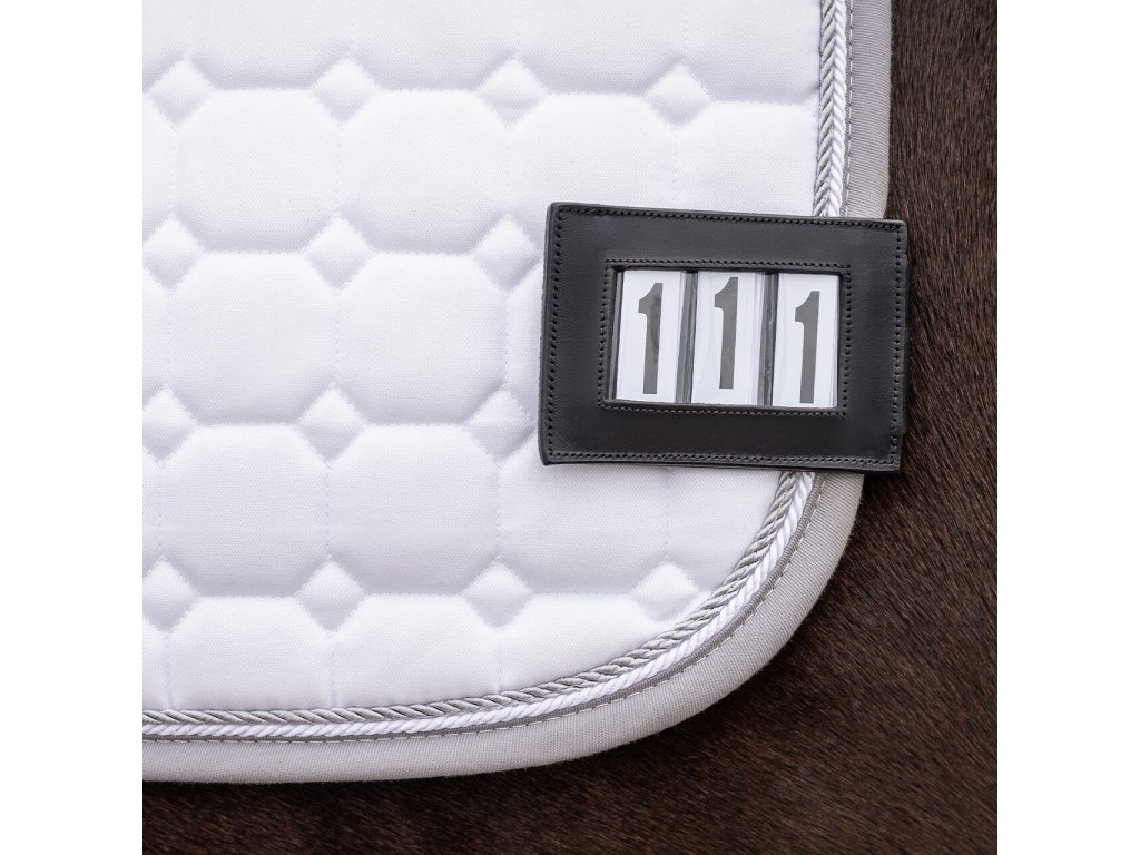 Kožený držák závodních čísel včetně kartiček s čísly na železné klipu. Je tedy velice snadné jej připevnit k sedlové dečce na zacvaknutí bez dírek do drahých látek.