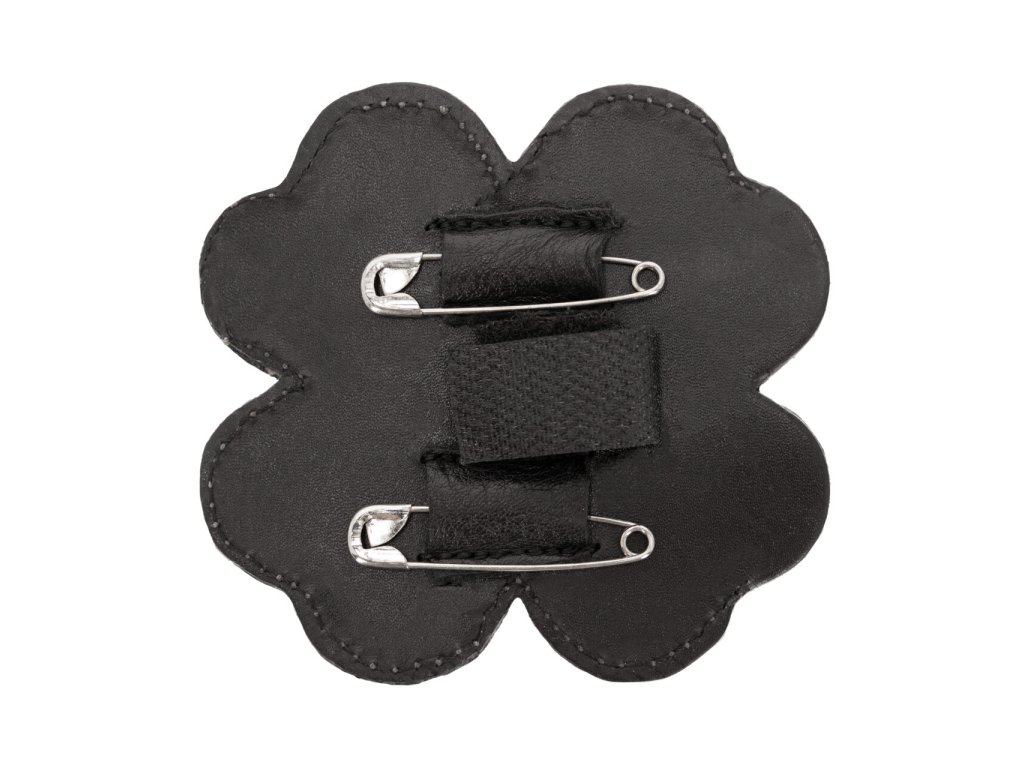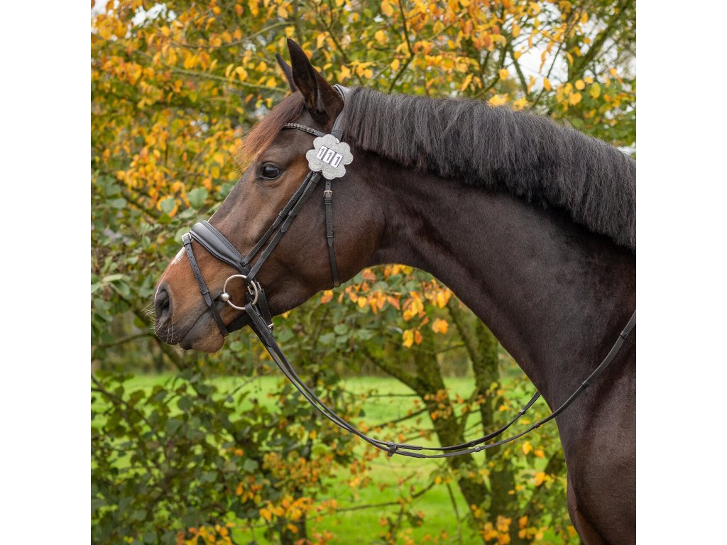 Držák závodních čísel včetně kartiček s čísly. Snadno se připevňuje k uzdečce nebo sedlové dečce pomocí zicherky. Ve tvaru čtyřlístku dozdoben flitry.
